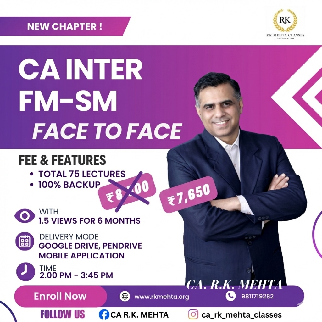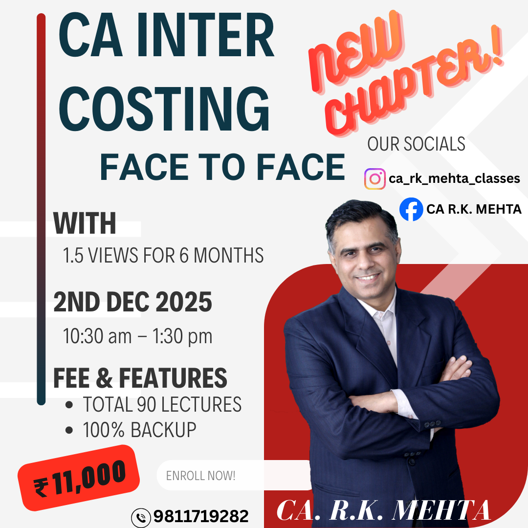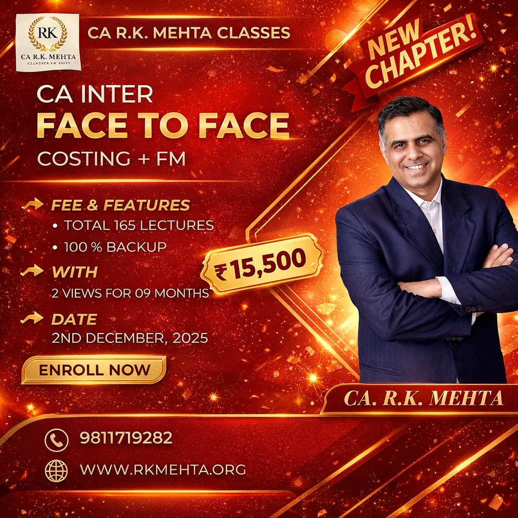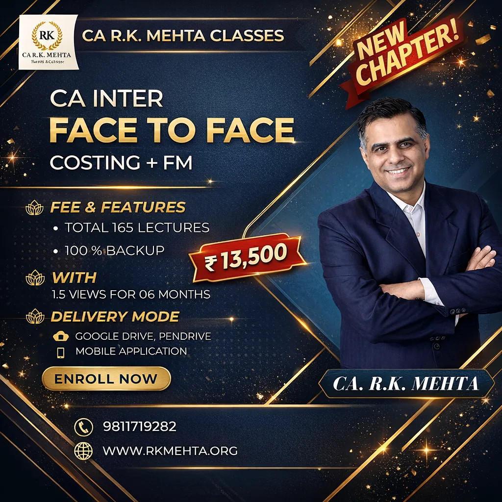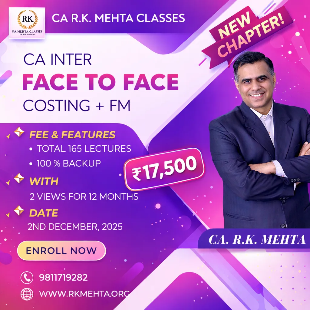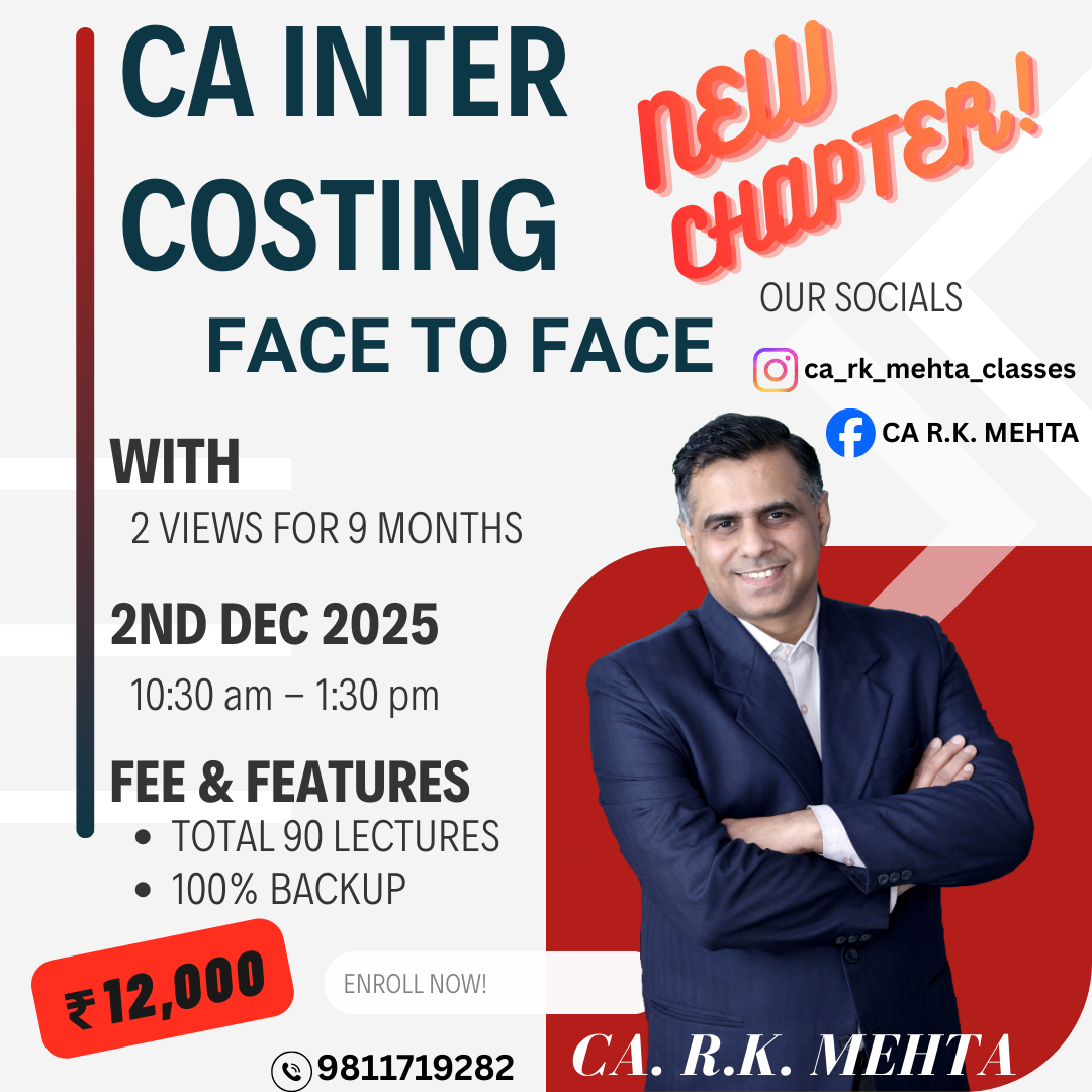 Boost your CA Intermediate preparation with India’s leading faculty and most trusted classes. Whether you're aiming for Group 1 or Group 2, our comprehensive video lectures and face-to-face batches are tailored to the New Syllabus and are ideal for upcoming exam attempts.